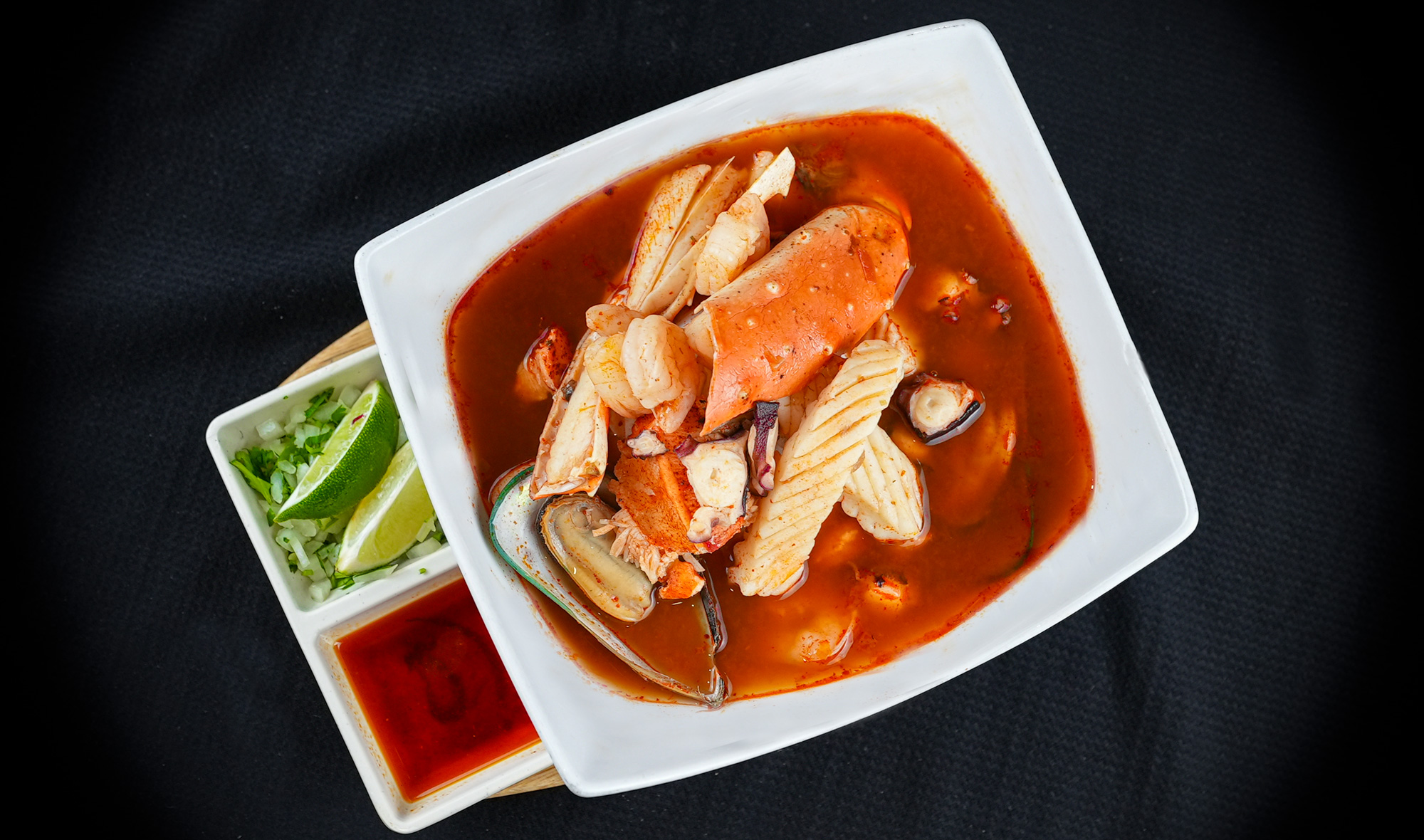 A robust and flavorful seafood stew featuring seven of the ocean's finest: shrimp, fish, scallops, clams, mussels, octopus, and crab.